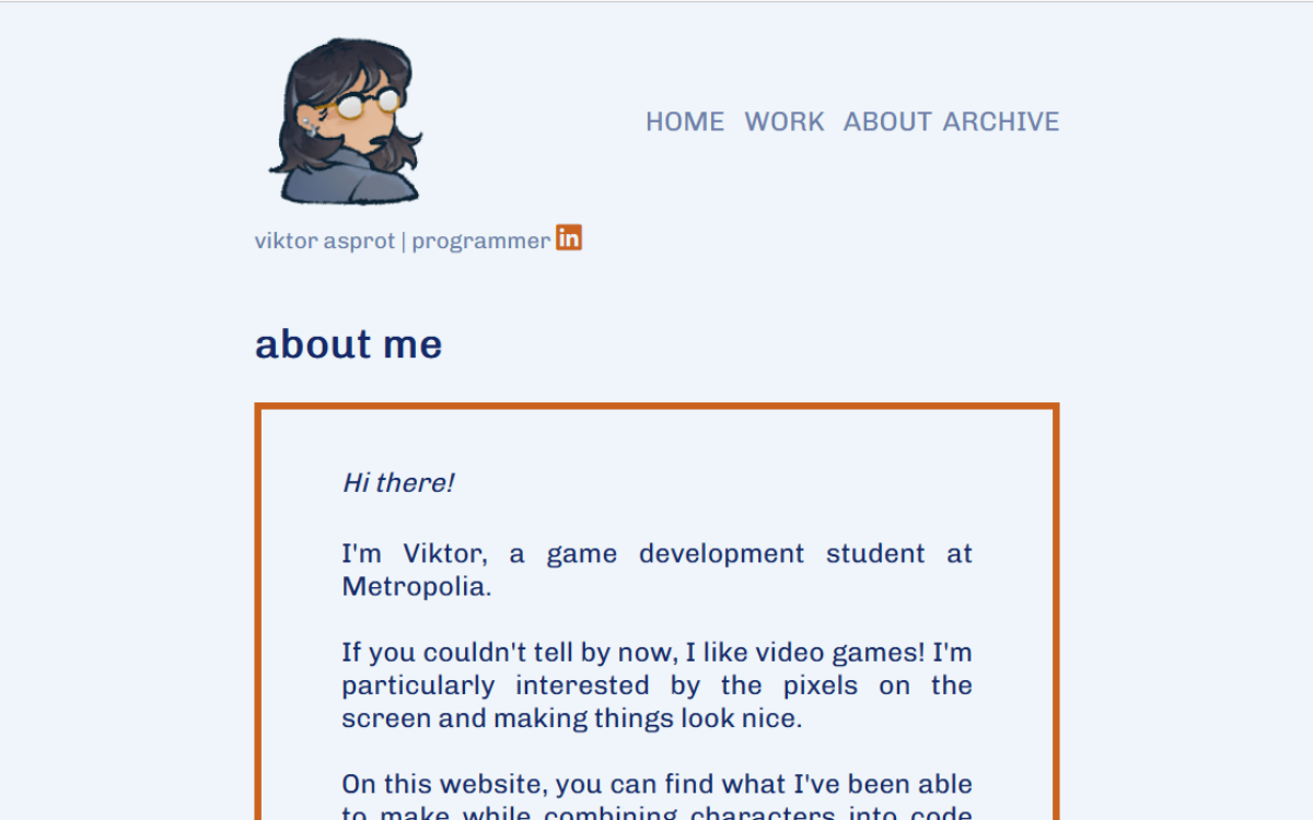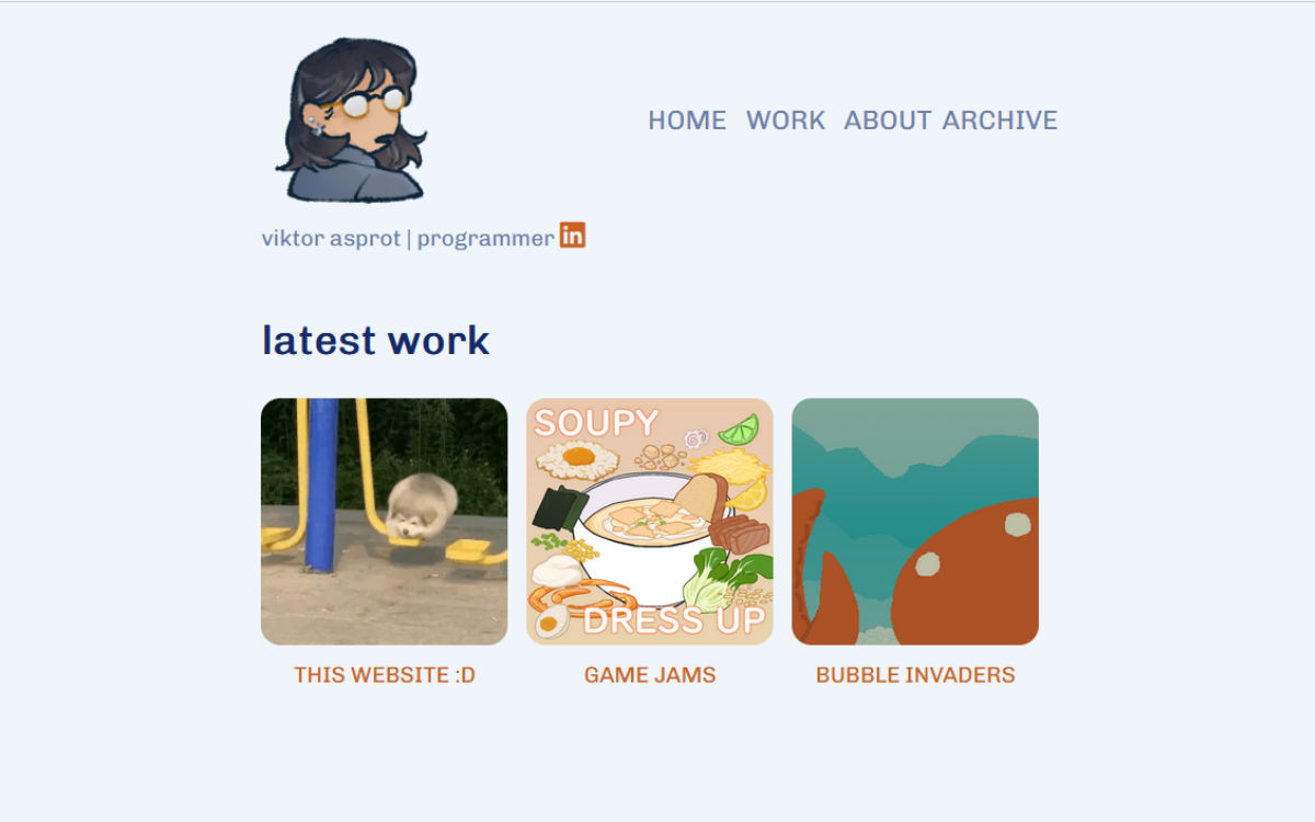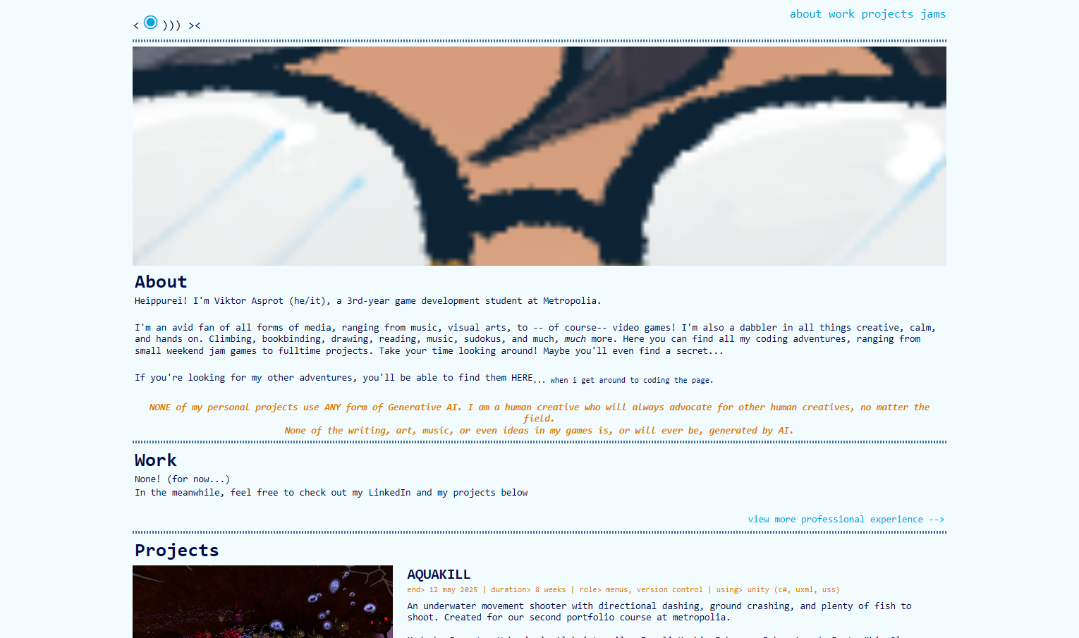 My current site! One pager, darkmode, and just everything listed out. Somewhat inspired by websites of researchers, where all their papers are listed in one LOOOONG line. Also heavily inspired by a coder from Seattle who had a really cool site! I have to find them again and credit them.